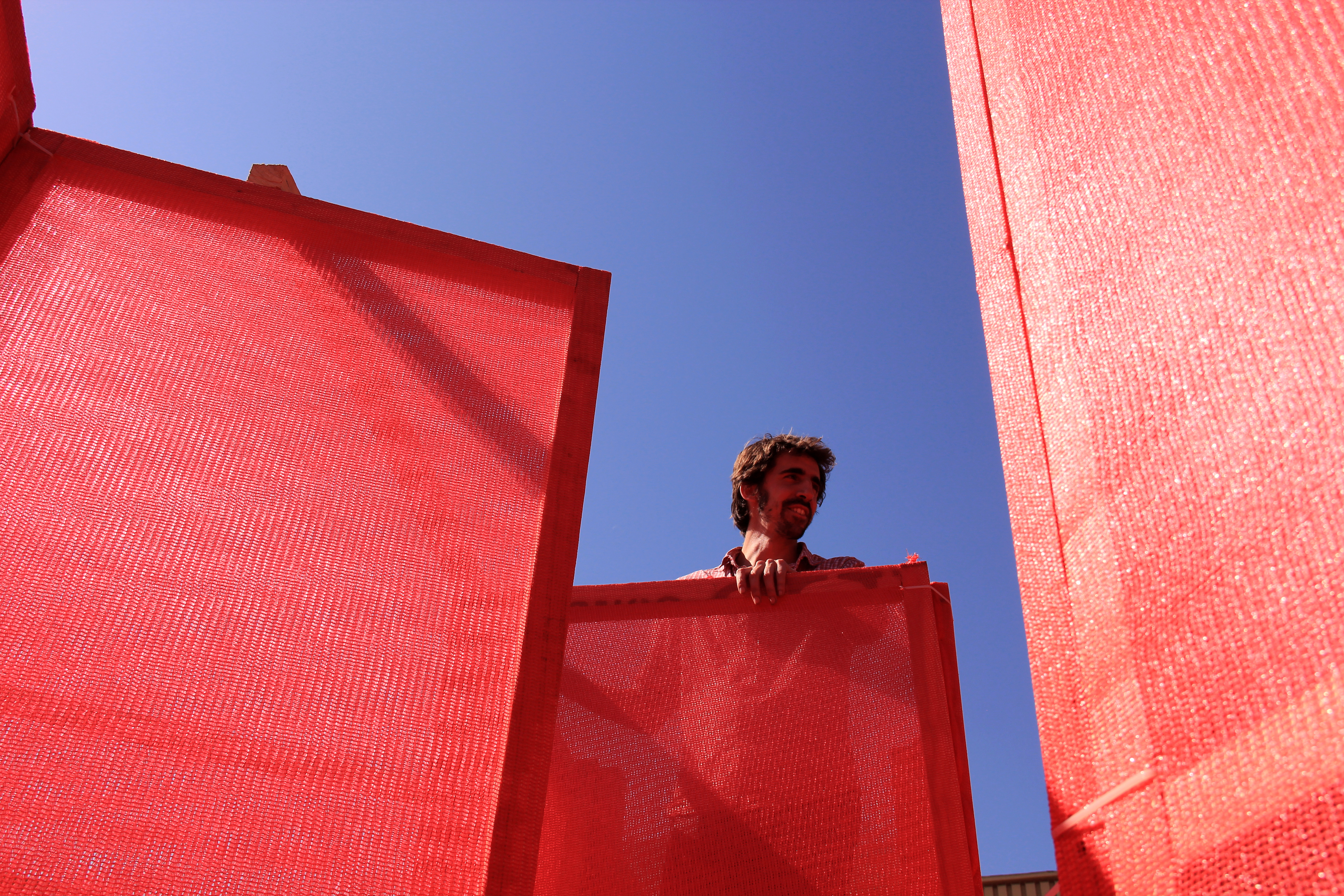 Made of modular wooden frame panels covered by a red translucent plastic textile, the structure is a maze, this ephemeral structure materilalizes the overlayered narratives and complexies embodied by urban configurations. Laberinto was a selected project for “Hecho en Casa” Festival of Urban Interventions, 2013.